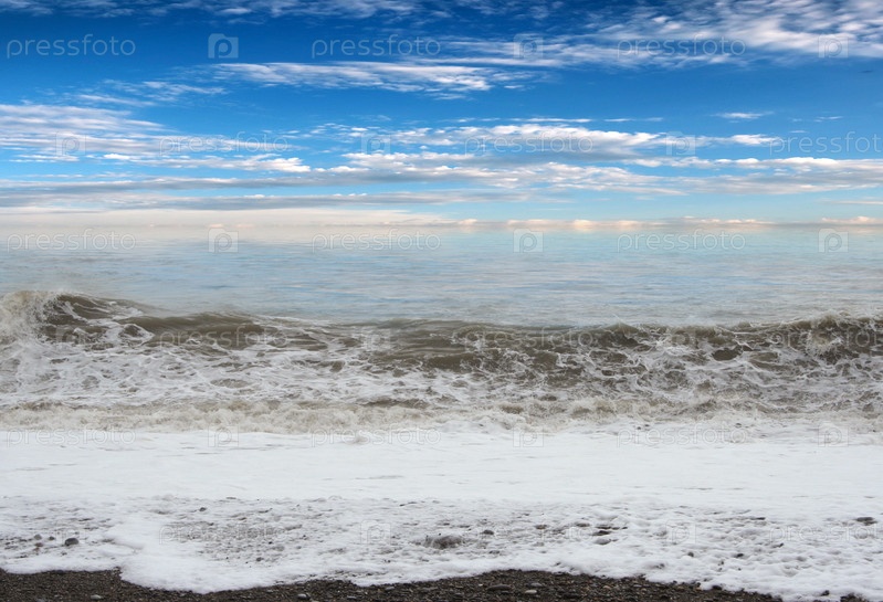 Штормовые волны и галечный пляж на берегу моря