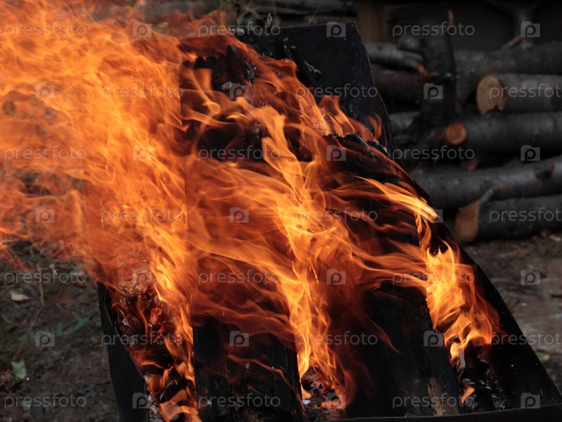 Языки раскаленного пламени в жаровне садового участка