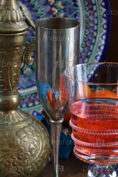 Восточный натюрморт с красным вином и апельсинами на деревянном фоне