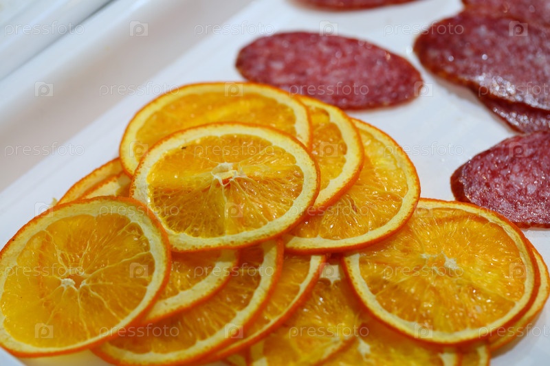 Нарезанный апельсин и колбаса на прилавке магазина
