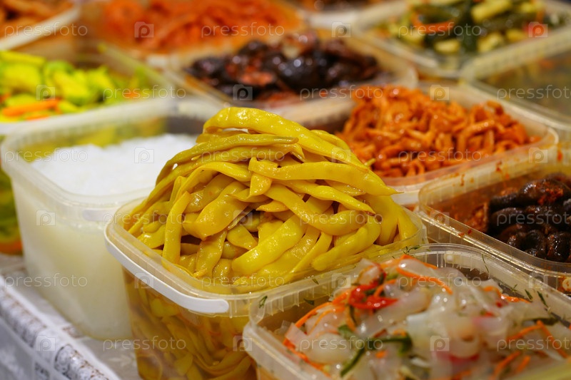 Корейские соленья на прилавке магазина