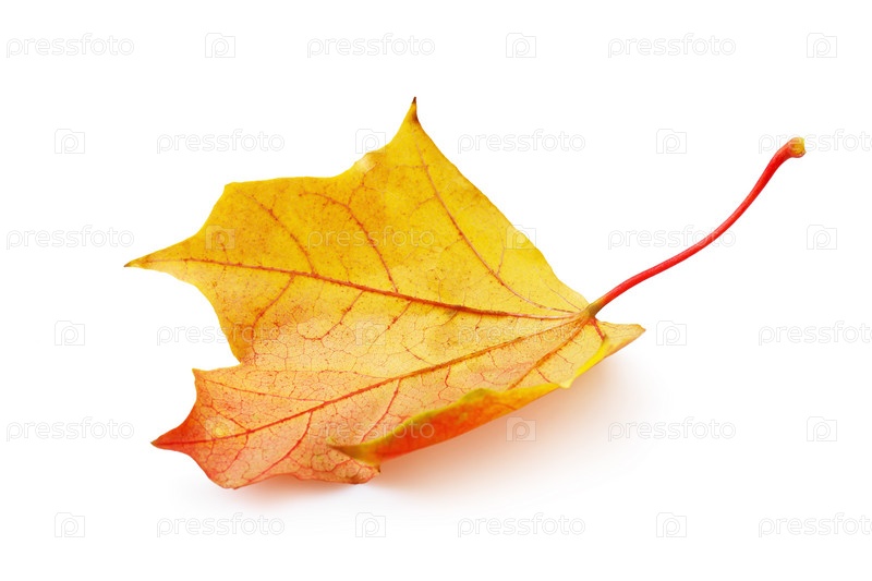 Упавший осенний кленовый лист в теплых желто-красных тонах, выделенный на белом фоне