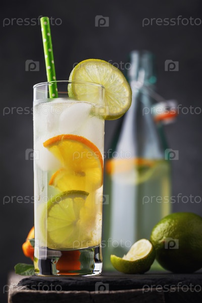 Тоник с лимоном и лаймом в прозрачном стакане с открытой бутылкой на деревянном столе