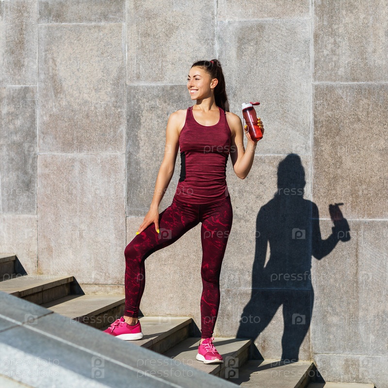 Молодая красивая девушка-спортсменка держит в руках бутылку с водой на фоне стены летним солнечным утром