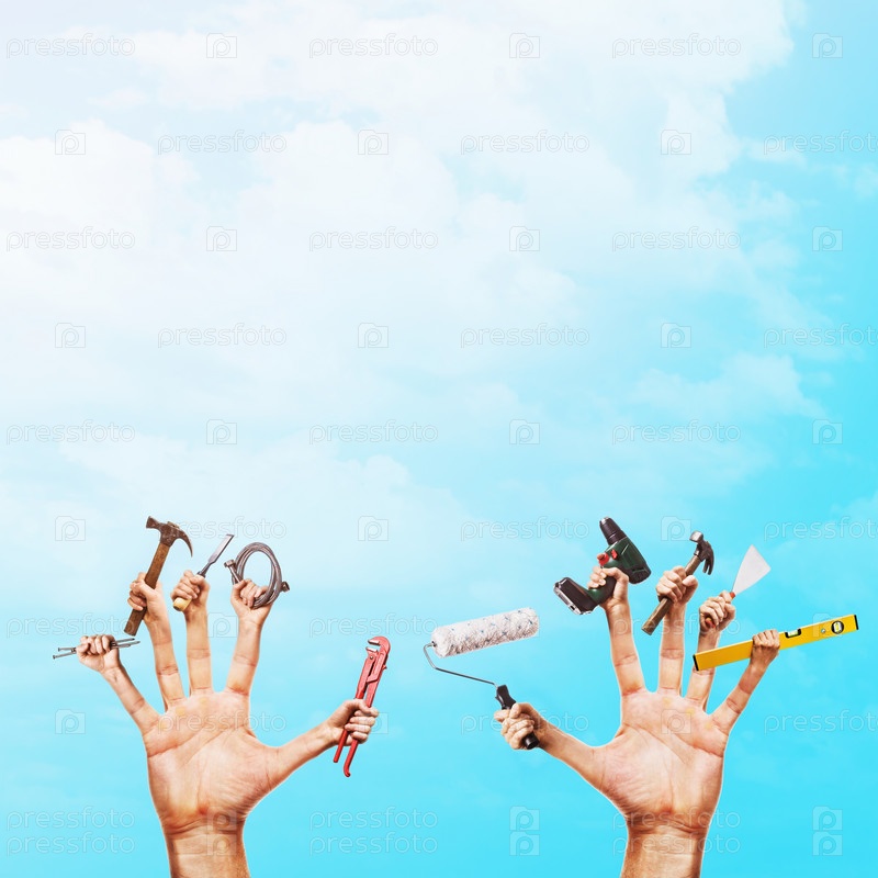 Различные строительные инструменты в руках на фоне голубого неба с копией пространства. Концепция разнорабочего