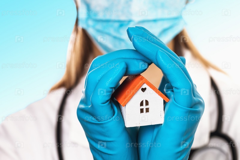 Доктор держит в руках игрушечный домик, крупный план. Концепция семейного врача