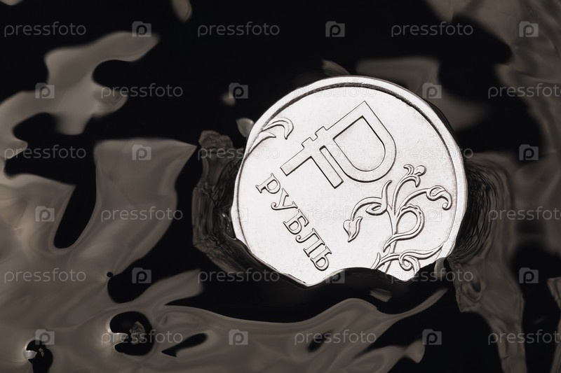 Российский рубль тонет в нефти, крупный план. Концепция падения валюты