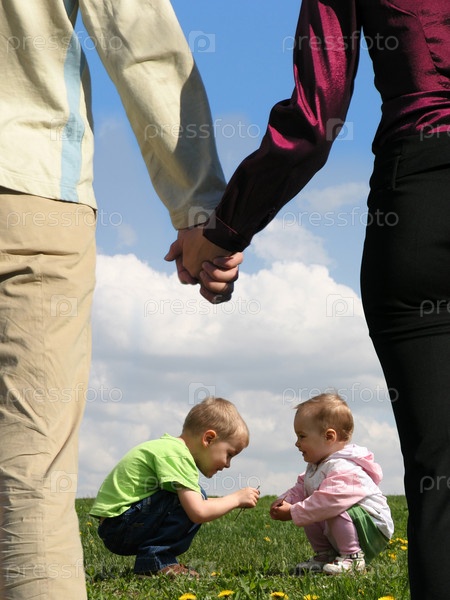 Родители держатся за руки на фоне детей в траве, коллаж