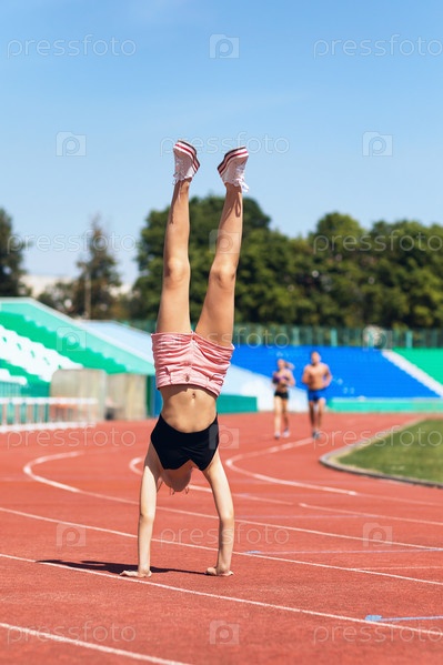 Девушка-подросток ходит на руках по стадиону. Концепция на тему здорового образа жизни