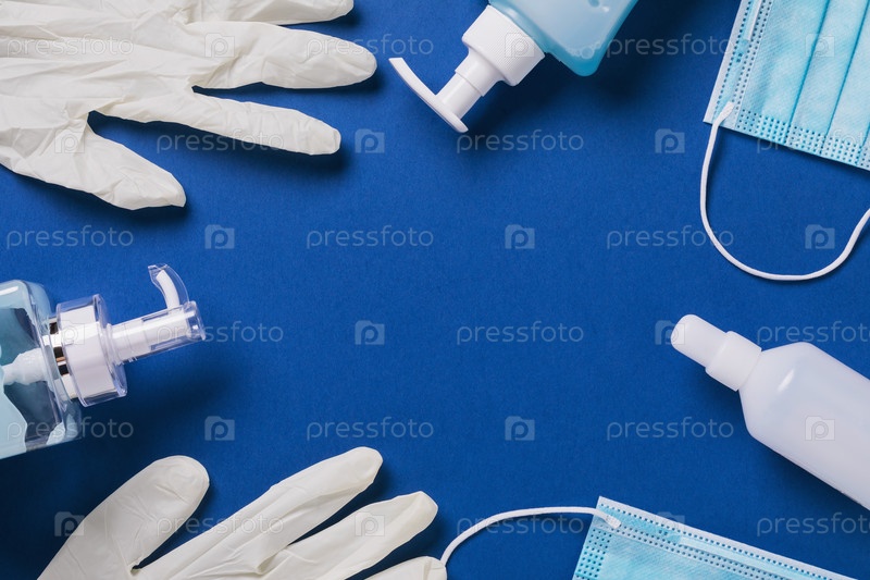Медицинские средства индивидуальной защиты на синем фоне с копией пространства в центре, вид сверху