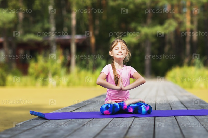 Маленькая девочка медитирует в парке, сидя в позе лотоса на деревянном мосту. Концепция на тему йоги для детей