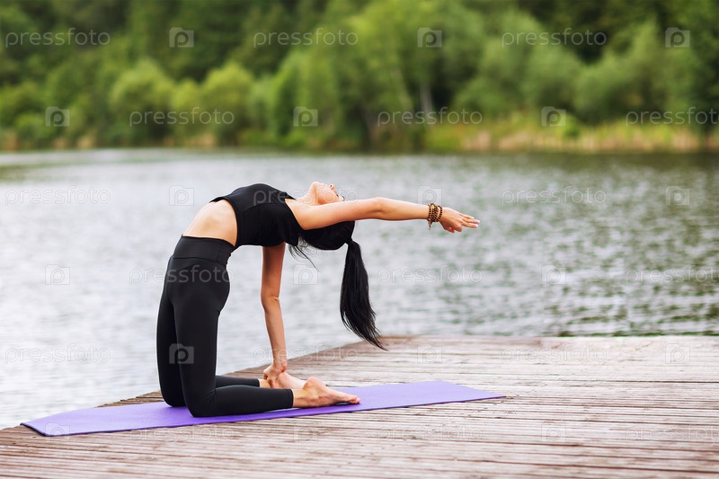 Молодая брюнетка с длинными волосами в черном спортивном костюме занимается йогой, сидя на коврике, разложенном на деревянных досках у реки