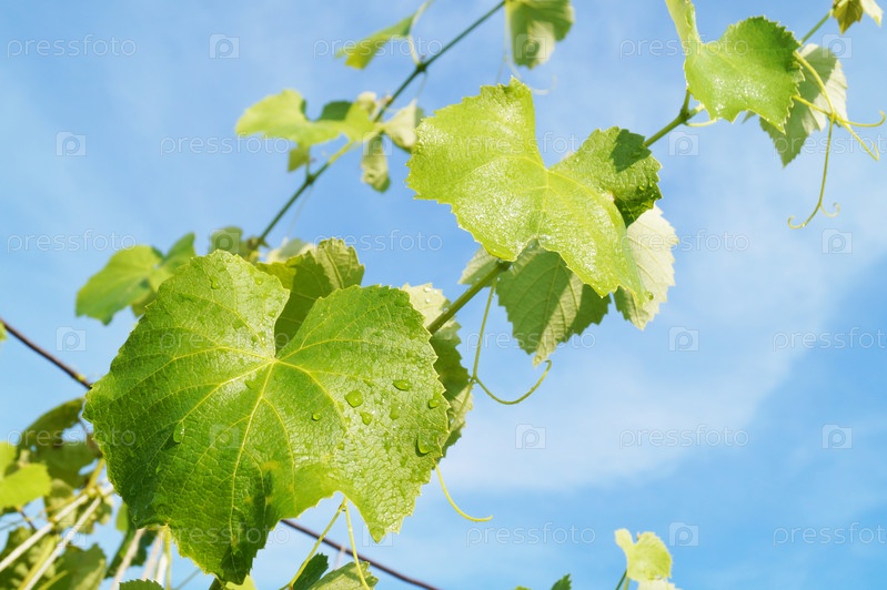 Зеленая ветвь виноградной лозы на фоне голубого неба