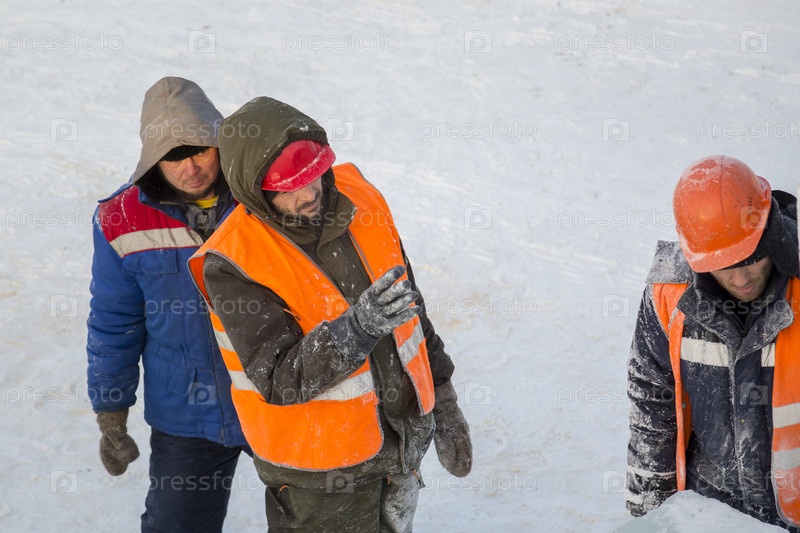 Трое рабочих разговаривают на стройке