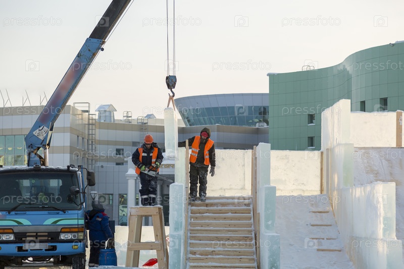 Рабочие на монтаже ледового городка