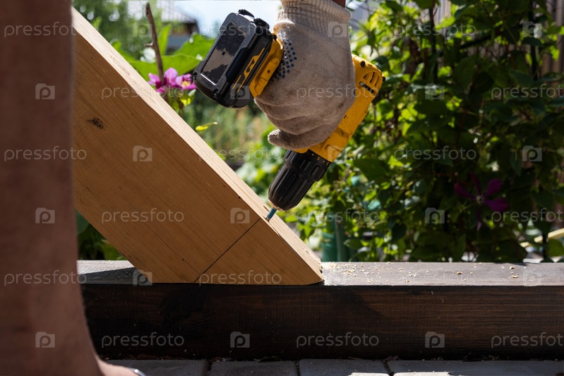 Плотник работает с желтой электрической отверткой, закручивает винт в деревянную балку