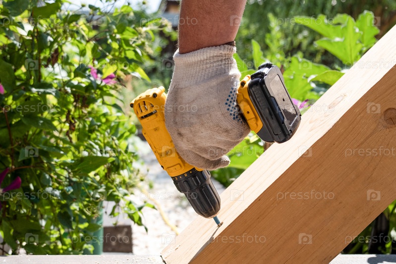 Плотник работает с желтой электрической отверткой, закручивает винт в деревянную балку