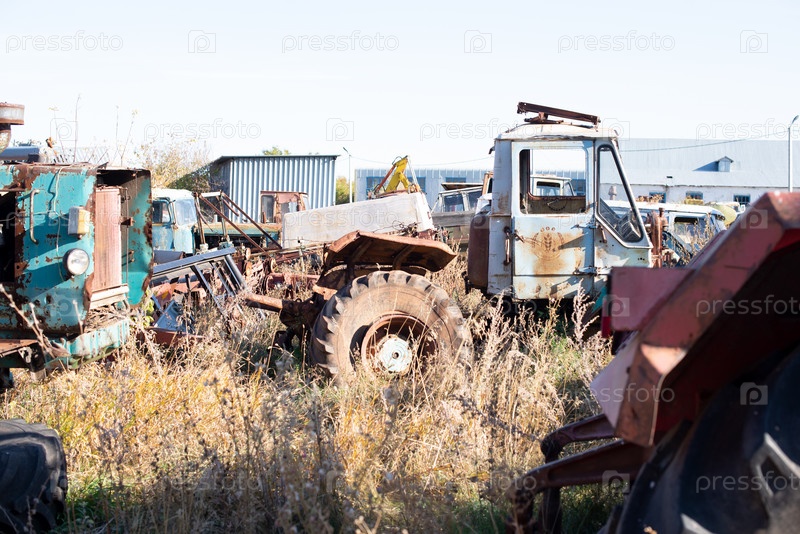 2020 Россия, октябрь. испорченная сельскохозяйственная техника хранится на старом автомобильном кладбище