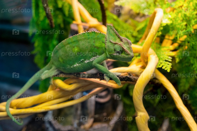 Зеленый хамелеон сидит на ветке близко. Дикие животные рептилии