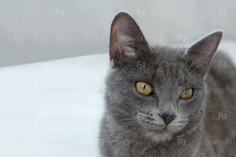 Серый кот с желтыми глазами лежит на сером фоне. Всемирный день кошек