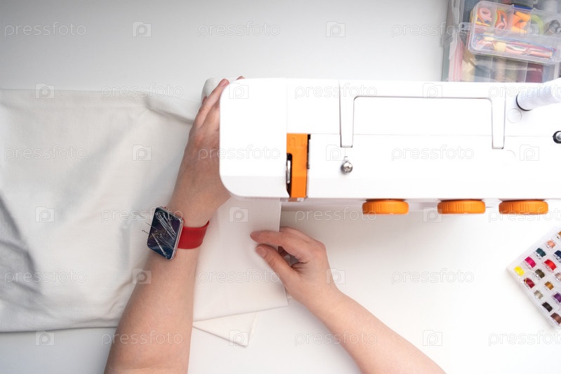 Настоящая женщина средних лет шьет одежду на швейной машине дома. Швея работает. Ручное изготовление одежды в домашнем интерьере. Женщина сидит, наслаждаясь процессом шитья одежды. дизайн творческих навыков, хобби и концепция малого бизнеса