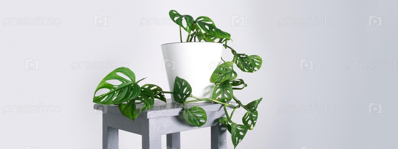 Листья маски обезьяны монстеры или косой или адансонии. Домашние растения в белом горшке. Концепция минимализма и скандинавского стиля, городские джунгли и садовая комната. Белый и серый фон