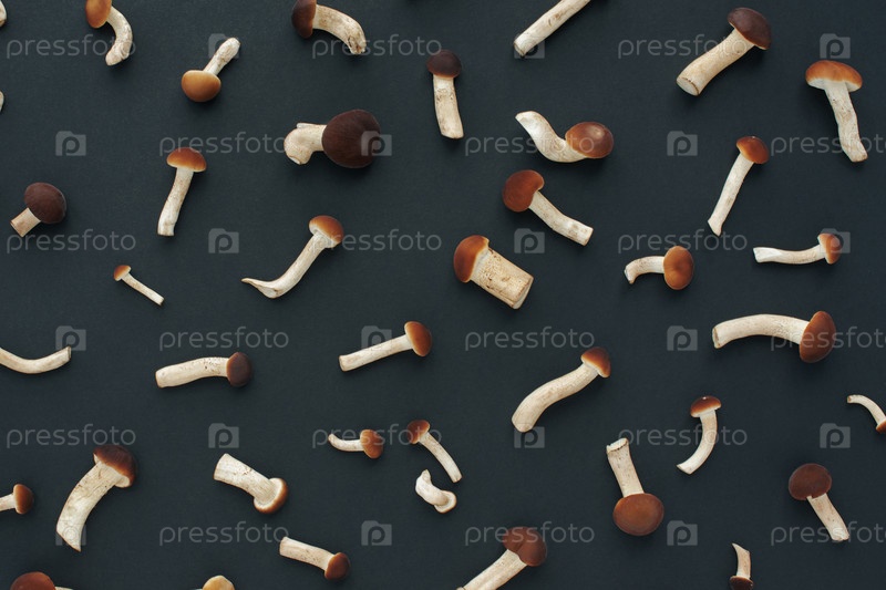 Грибы, опята на черном фоне. Черная каменная доска. Скопируйте пространство. Шаблон