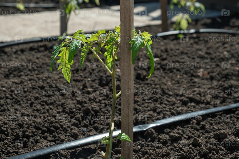 Рассада помидоров выращивается на грядках с системой автоматического полива или капельной воды в домашнем огороде. Шланг для полива и орошения