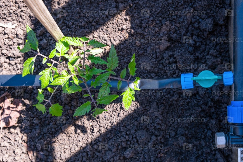 Рассада помидоров выращивается на грядках с системой автоматического полива или капельной воды в домашнем огороде. Шланг для полива и орошения