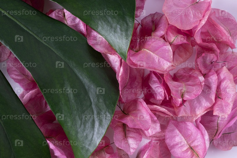Лист монстера с розовыми сухими цветами мраморного фона. фон для эко продуктов, косметики