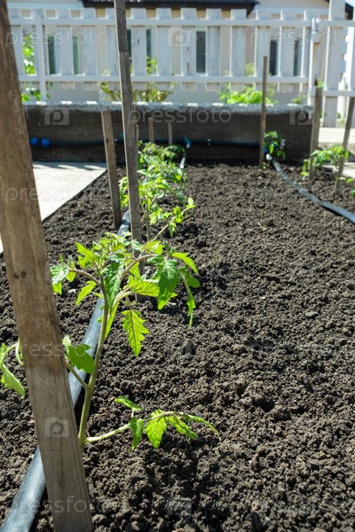 Рассада помидоров выращивается на грядках с системой автоматического полива или капельной воды в домашнем огороде. Шланг для полива и орошения