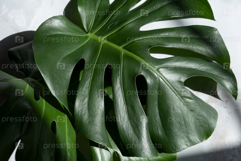 Растение монстра на фоне серого мрамора. концепция минимализма. Monstera deliciosa или швейцарский сырный завод тропические листья фон