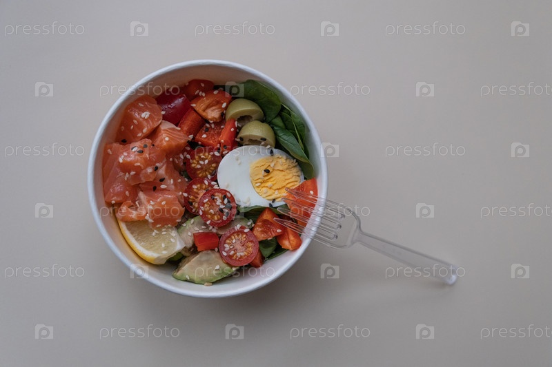 Поке на вынос со свежим лососем, авокадо, киноа и овощами в упаковке из переработанной крафт-бумаги. Здоровая модная еда для фитнеса