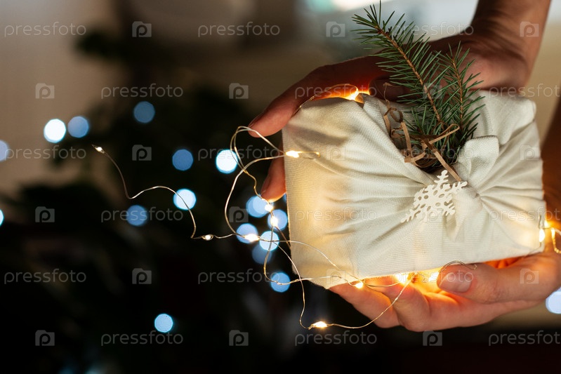 Рождественский подарок. Упаковка из экологически чистых материалов, ткань фурошики. Боке, выборочный фокус