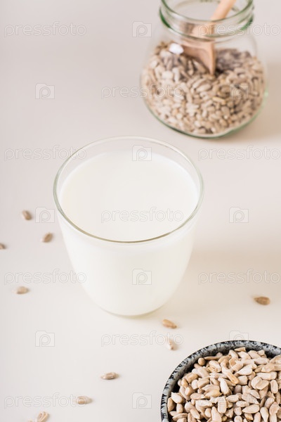 Безмолочное подсолнечное молоко в стакане и семечки в миске на столе. Здоровая пища. Вертикальный вид