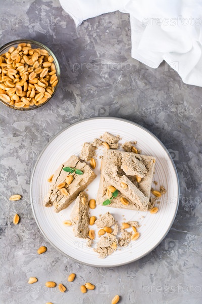 Кусочки подсолнечной и арахисовой халвы и листья мяты на тарелке и миска орехов на столе. Калорийное восточное лакомство. Верхний и вертикальный вид