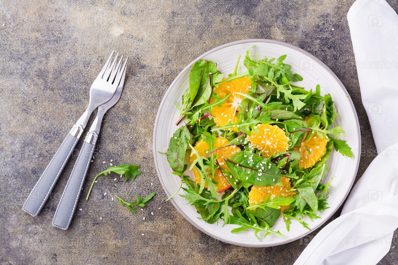 Диетический вегетарианский витаминный салат из кусочков апельсина и смеси листьев рукколы, мангольда и мизуна на тарелке на столе. Вид сверху