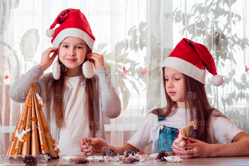 Рождество ручной работы. Девочки украшают бумажное дерево и разбирают украшения