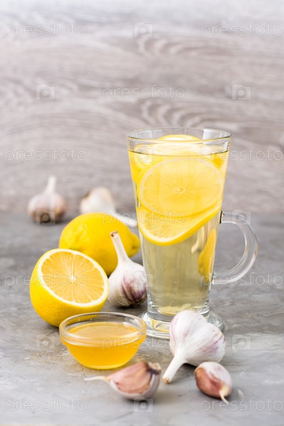 Лечебный напиток из лимона, меда и чеснока в стакане на столе. Альтернативная медицина