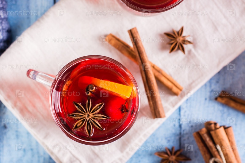 Глинтвейн с корицей, апельсином и ягодами в стаканах. Зимние домашние напитки. Вид сверху. Крупный план