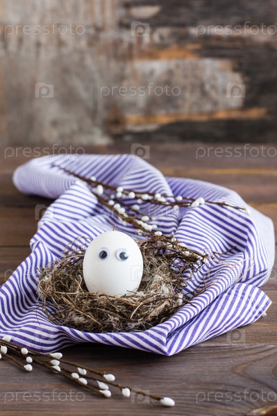 Счастливой Пасхи. Одно неокрашенное куриное яйцо с глазами в птичьем гнезде и ветвями ивы на деревянном столе. Концепция отказа от красителей в пищевых продуктах. Копировать пространство