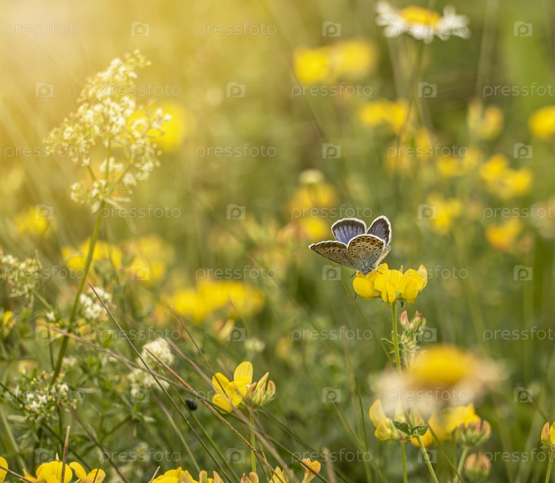 Бабочка и желтые цветы в летнем поле