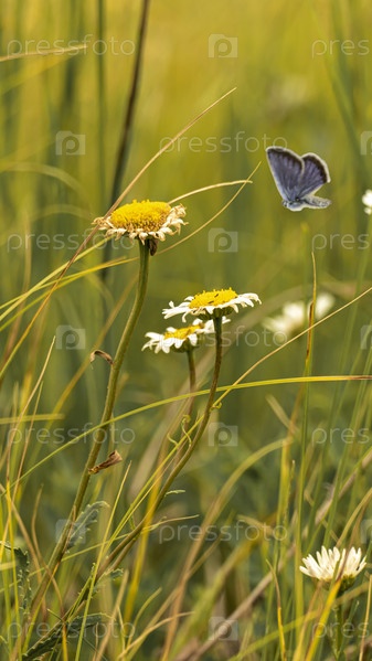 Голубая бабочка и полевые цветы жарким летом
