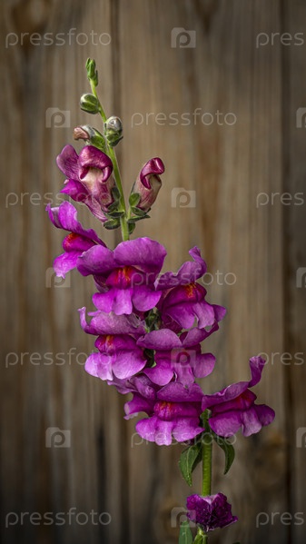 Львиный зев цветет в саду у деревянной стены