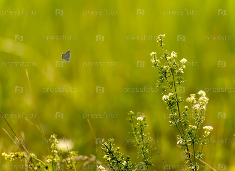 Голубая бабочка и полевые цветы жарким летом