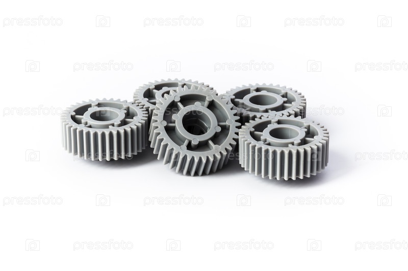Пять серых пластиковых шестерен на белом фоне крупным планом