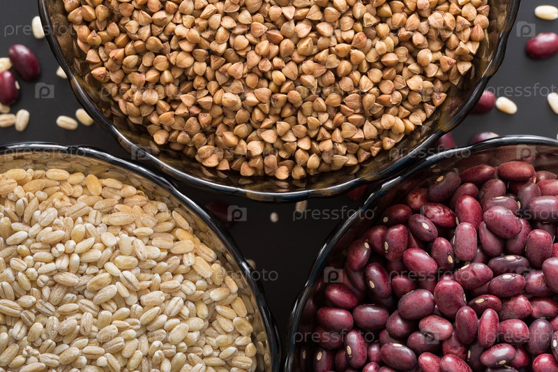 Три стеклянные миски с гречневой крупой, фасолью и ячменем
