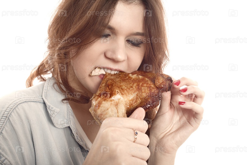 Женщина ест жареную курицу