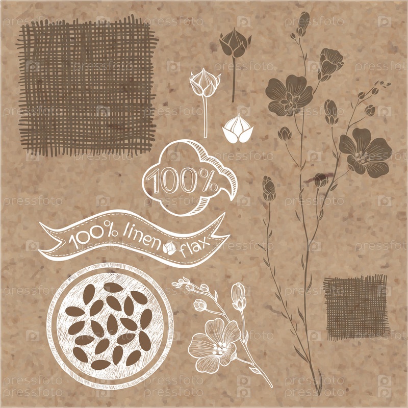Лен набор. Льняные этикетки, наклейки и элементы, изолированные на фоне крафт-бумаги