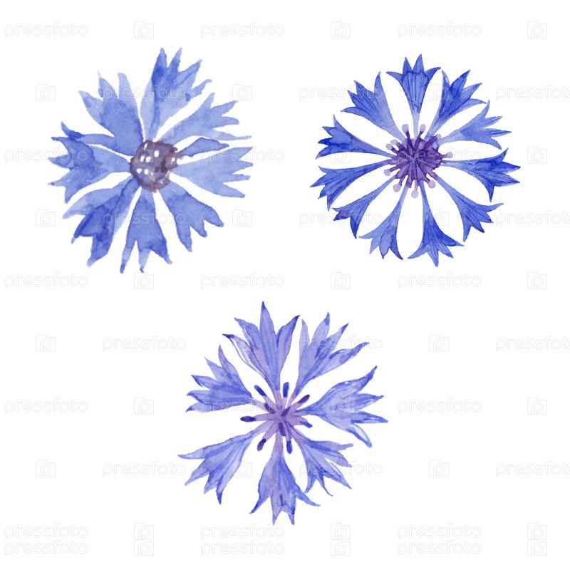 Набор акварельных васильков. Василек, изолированные на белом фоне. Векторная иллюстрация